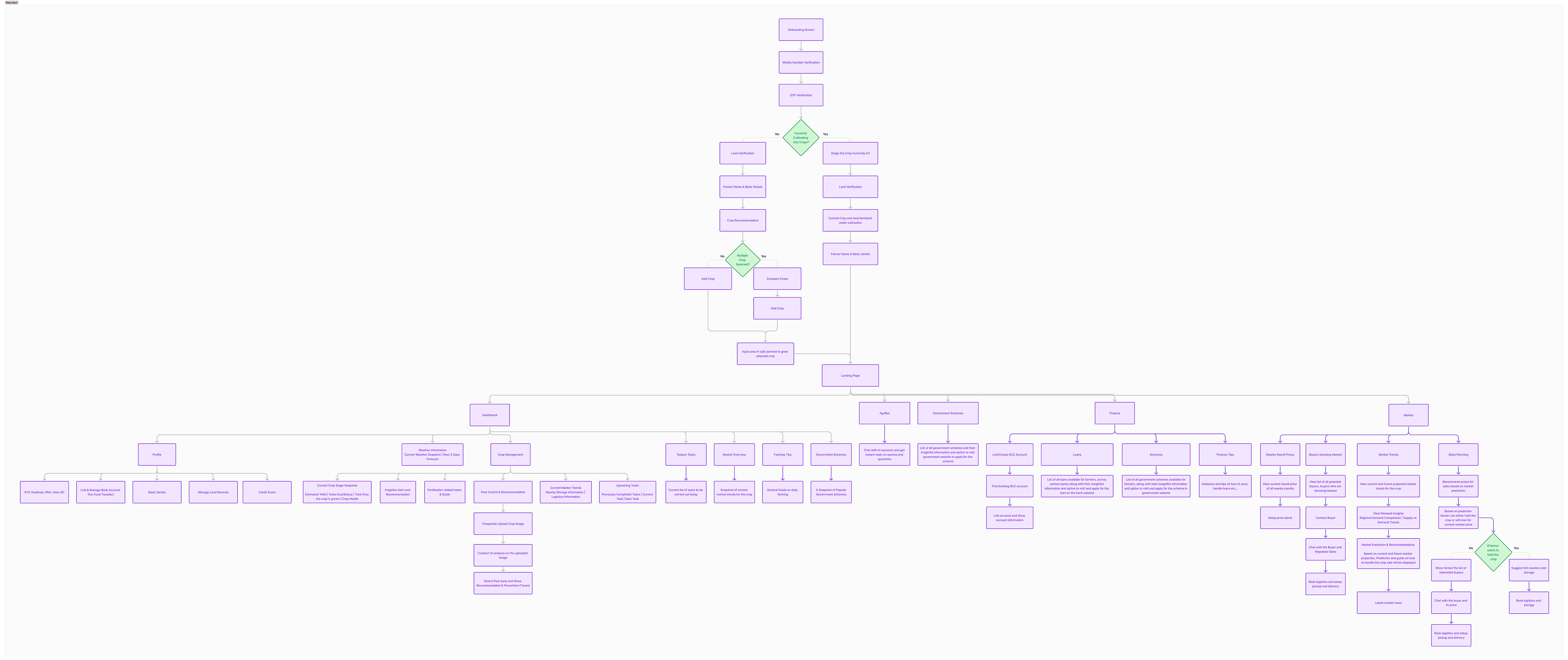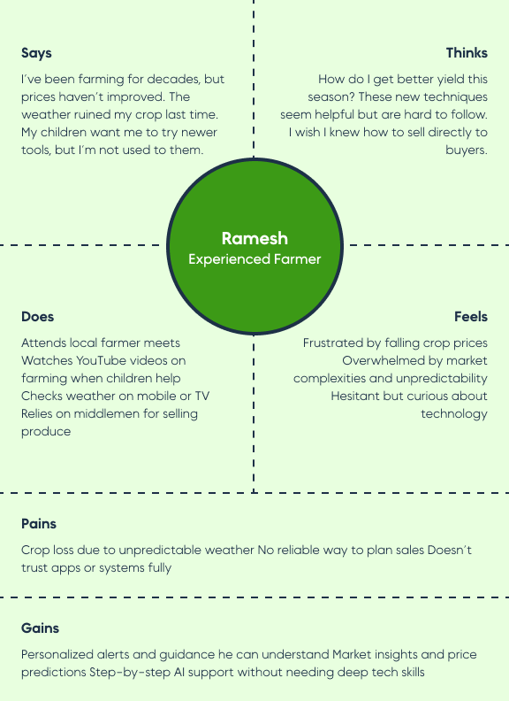 | 1. Start of the Season | Picks crop based on tradition, talks to middlemen or neighbors | Confused, unsure | Relies on outdated techniques, no forecast data | Offer AI-based crop suggestions based on land and market |
