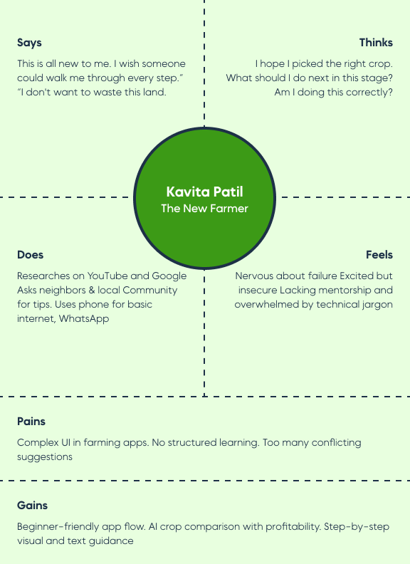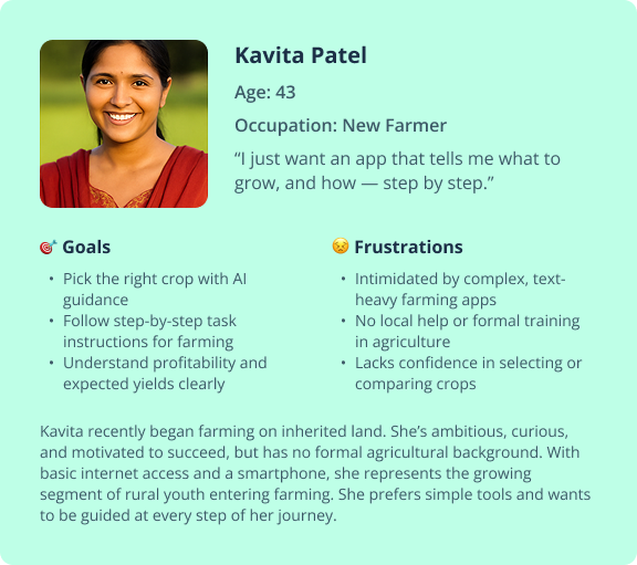 | 2. Learning the Basics | Reads blogs, asks others, joins WhatsApp groups | Overwhelmed | Inconsistent advice, no structured steps | Provide in-app crop guides, checklists, comparison tools |
