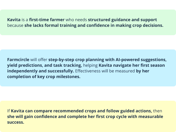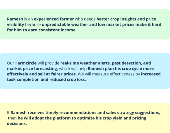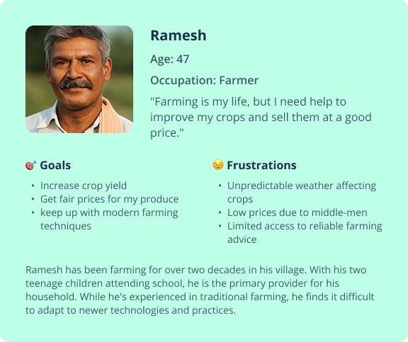 Design implication: Farmers need a localized, voice-first, offline-capable assistant that turns complex data (weather, prices, finance, schemes) into simple, daily, stage-wise actions.