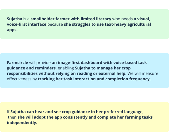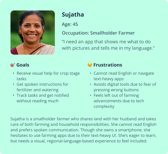Most digital products assume literacy, stable internet, and digital familiarity. But for farmers like Sujatha and Kavita, visual, voice-first, and offline-first design is essential not optional.