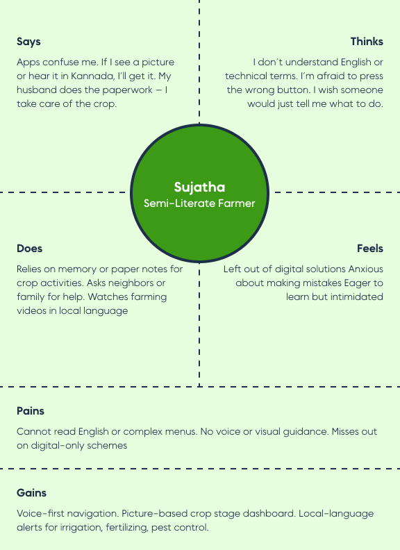 | 1. Crop Selection | Asks husband/community, guesses best crop | Unsure | Can’t use crop selection apps | Enable voice-based crop suggestions in local language |